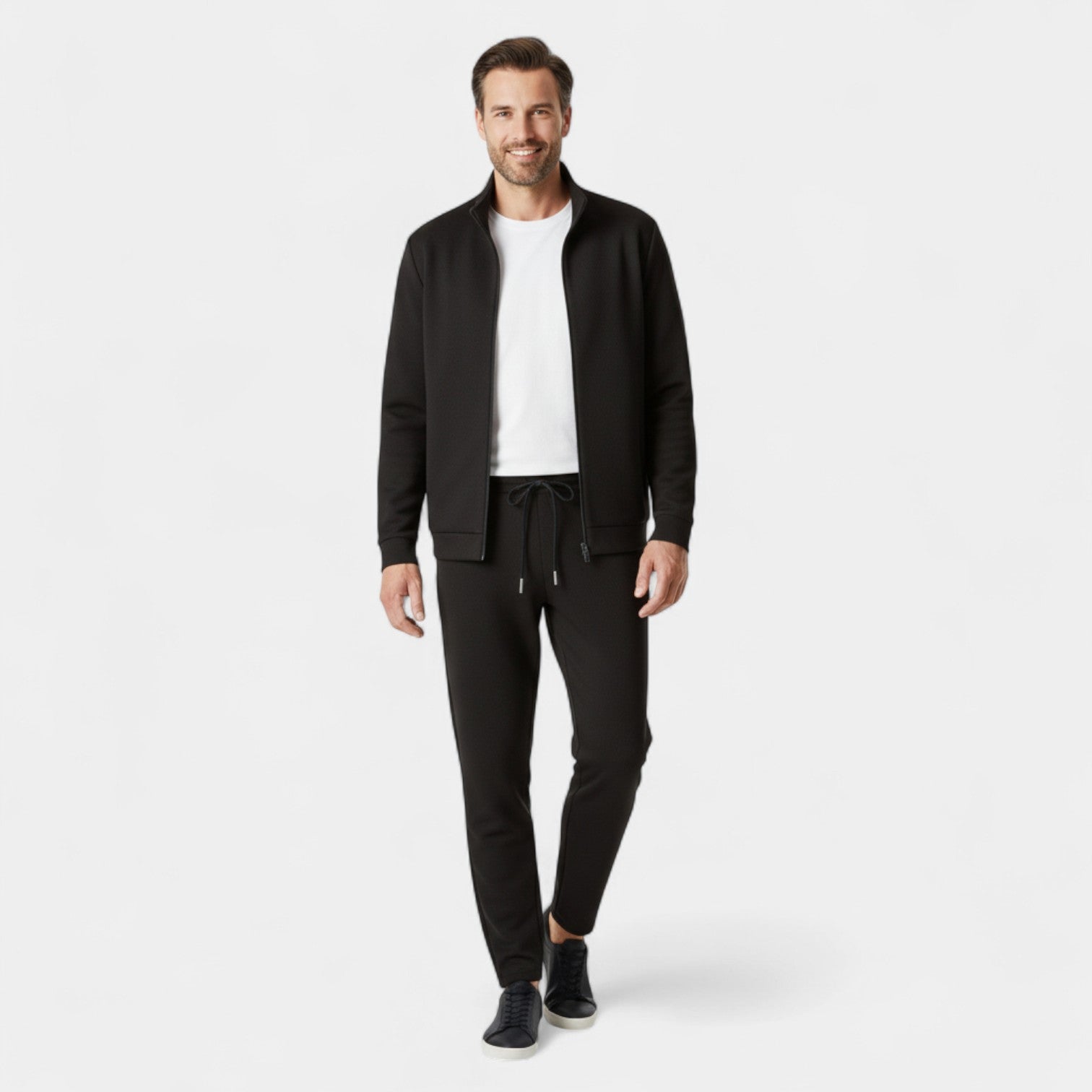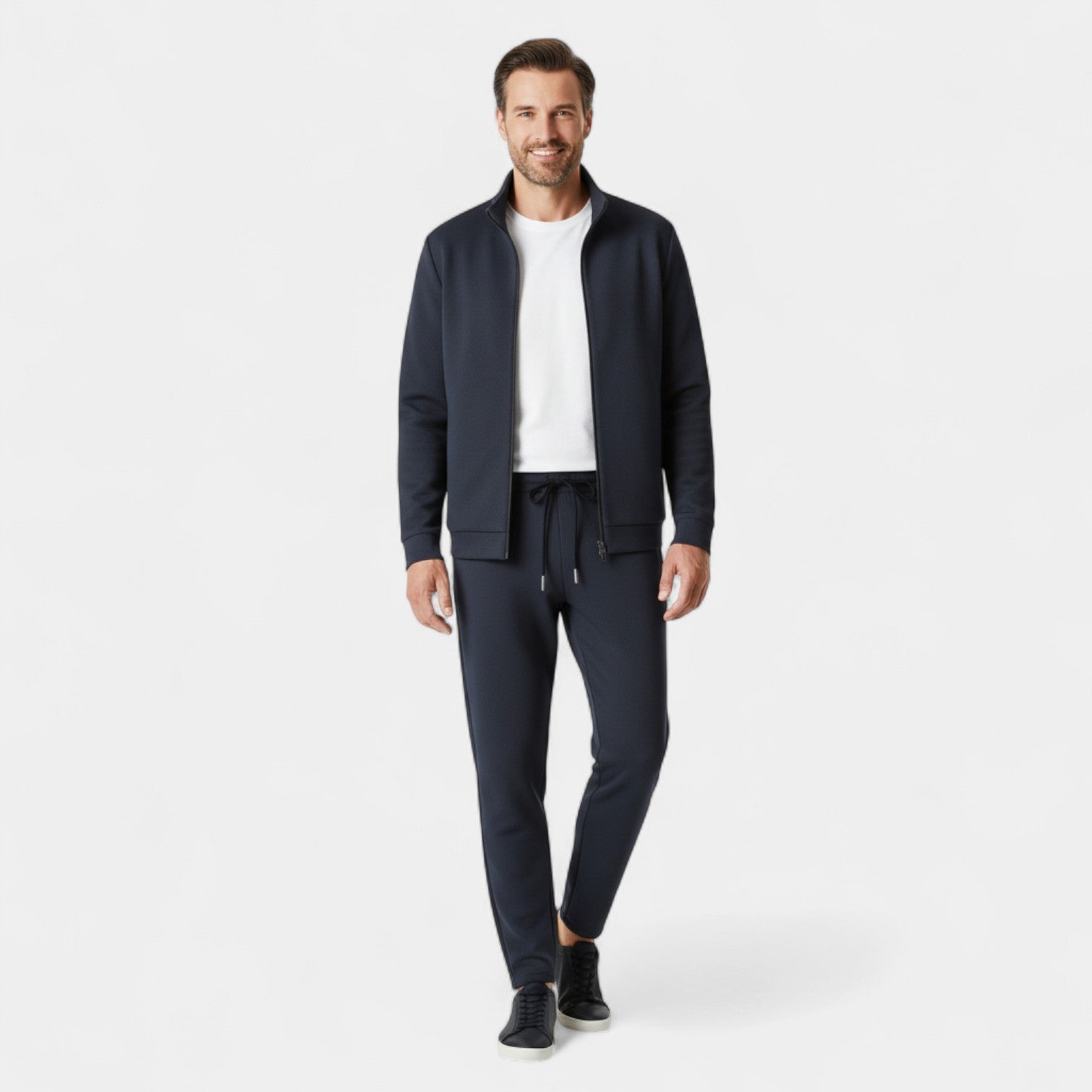 Pensé pour l’homme qui avance avec intention dans l’élan comme dans la détente. Cet ensemble deux pièces marie la rigueur sportive à une élégance décontractée. La veste zippée structure la silhouette avec retenue, tandis que le pantalon fuselé assure une liberté de mouvement raffinée.
