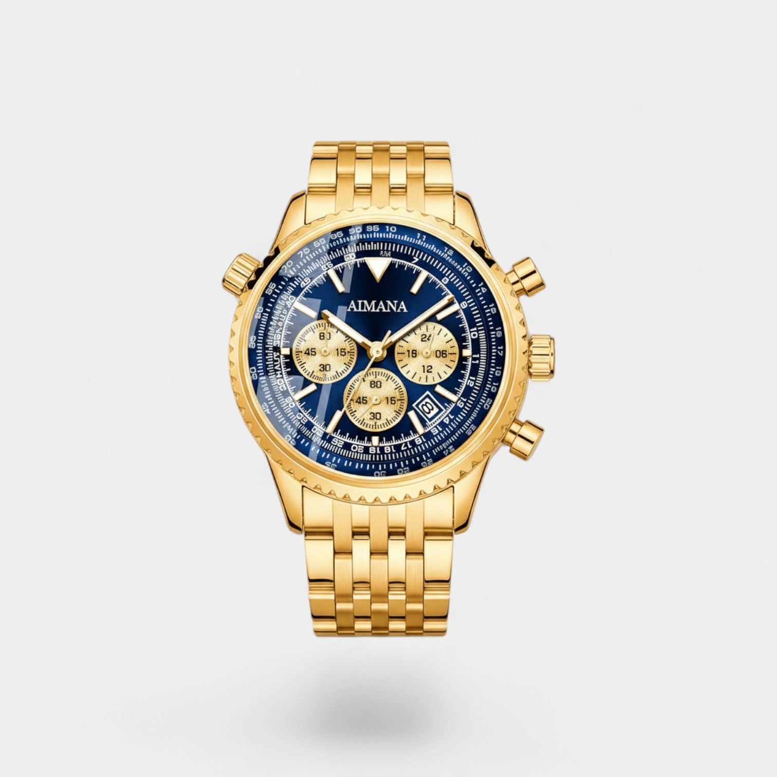 - Finitions / Codes de style: Cadran lumineux 43 mm, configuration à six aiguilles, boîtier et bracelet polis dorés
